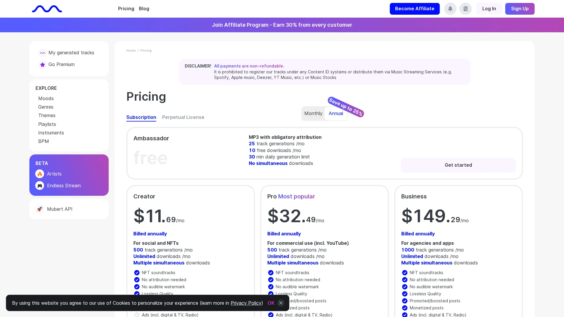 About Mubert Ai : Mubert is an AI music generation platform offering royalty-free tracks for various projects. It provides access to thousands of staff-picked tracks and allows users to buy royalty-free music at competitive pricing.