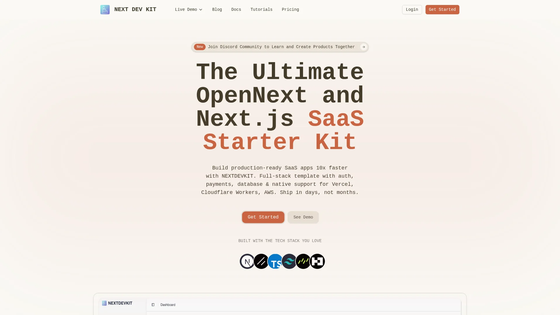 Build and deploy production-ready SaaS apps faster with NEXTDEVKIT. Full-stack OpenNext & Next.js Template or Boilerplate with auth, payments, database & native support for Vercel, Cloudflare Workers, AWS.