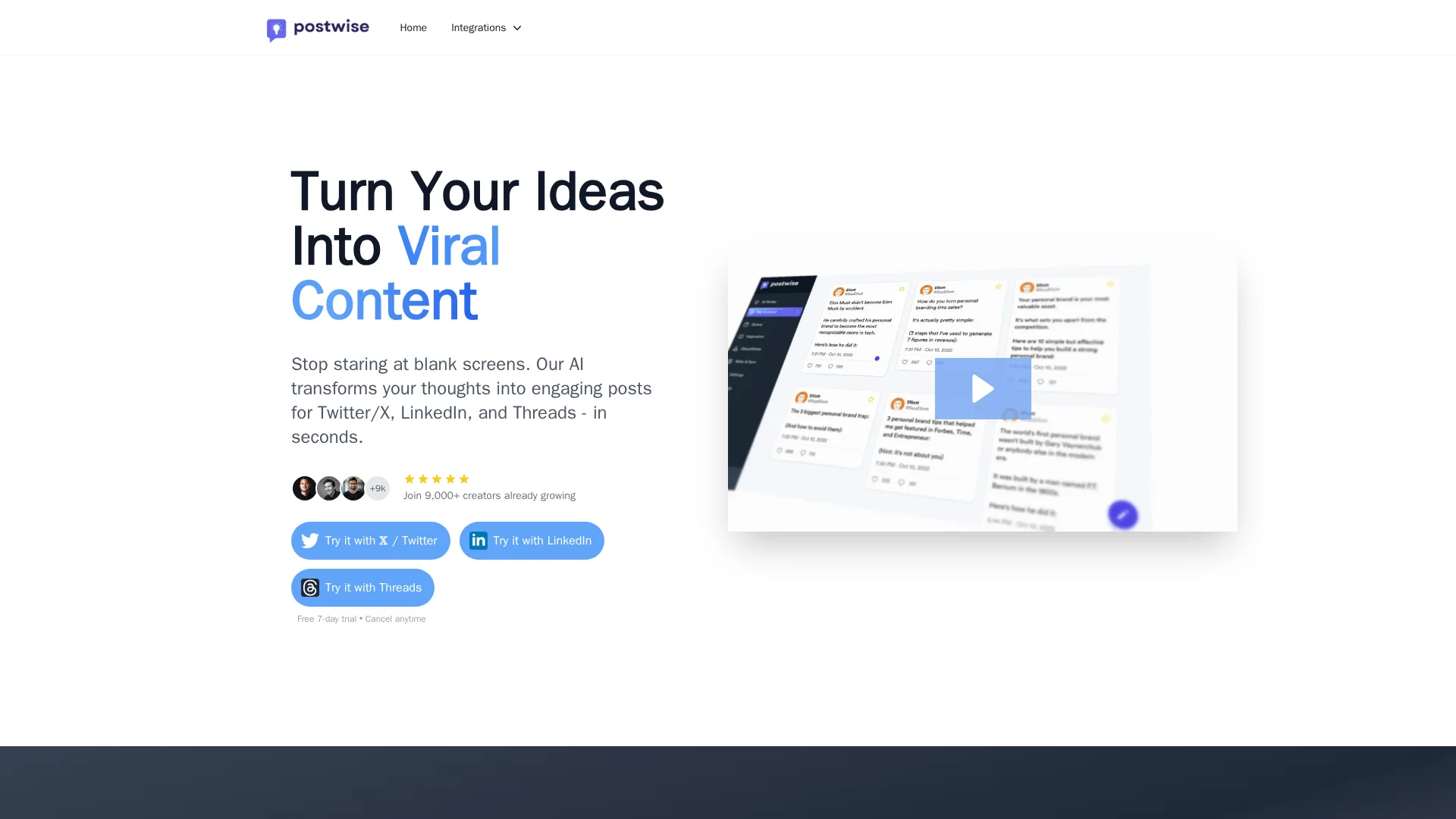About Postwise : Transform your thoughts into viral content with Postwise, an AI content generator that helps you create engaging posts for Twitter, X, LinkedIn, and Threads. Say goodbye to writer's block and hello to social media success.category: AI Content Generationtarget audience: {'industry': 'Social Media, Marketing', 'professional': 'Content Creators, Marketers, Businesses'}