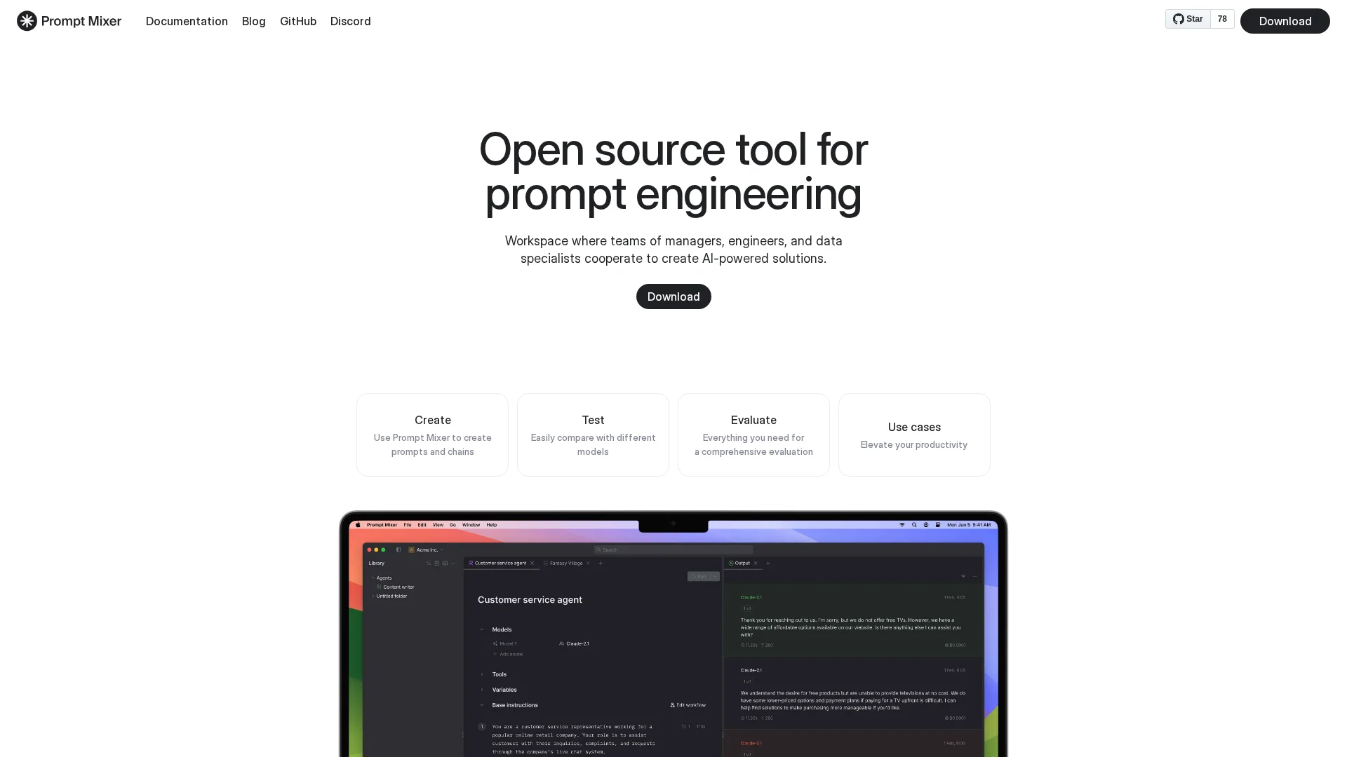 About Prompt Mixer : Prompt Mixer is an open-source tool for prompt engineering, providing a collaborative workspace for managers, engineers, and data experts to develop AI features.