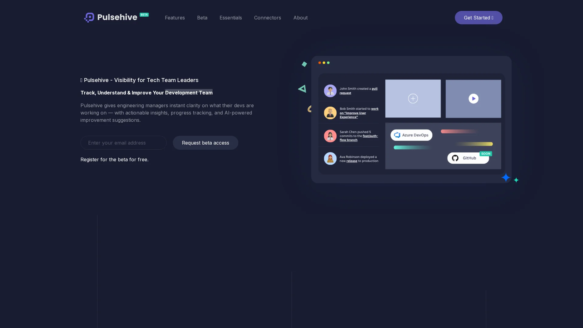 Pulsehive gives tech managers visibility into dev teams with activity feeds, performance reports, and insights to improve team productivity.