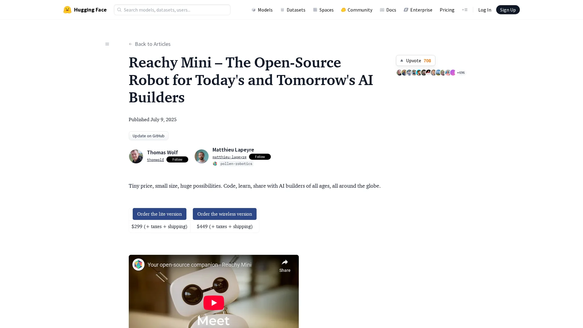 About Reachy Mini : Reachy Mini is an open-source robot designed to aid AI builders and researchers. It advances and democratizes artificial intelligence through open source and open science.