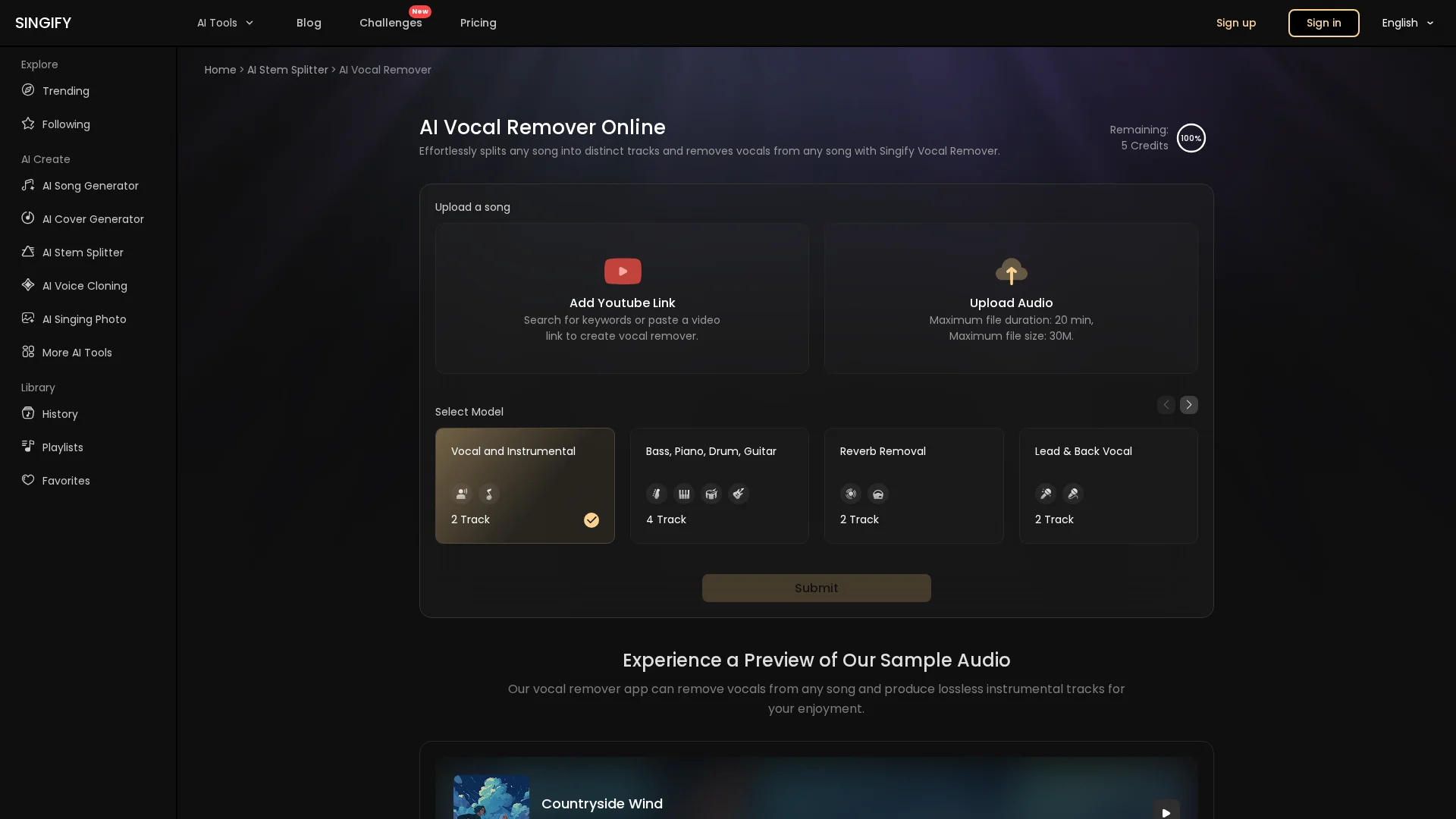 Instantly split music into clean vocals and instrumentals online. Singify Vocal Remover free online extracts vocals or isolate voice and instruments from any song, perfect for creating high-quality karaoke, backing tracks, acapella, or instrumentals. Fast, free, and easy to use with AI.