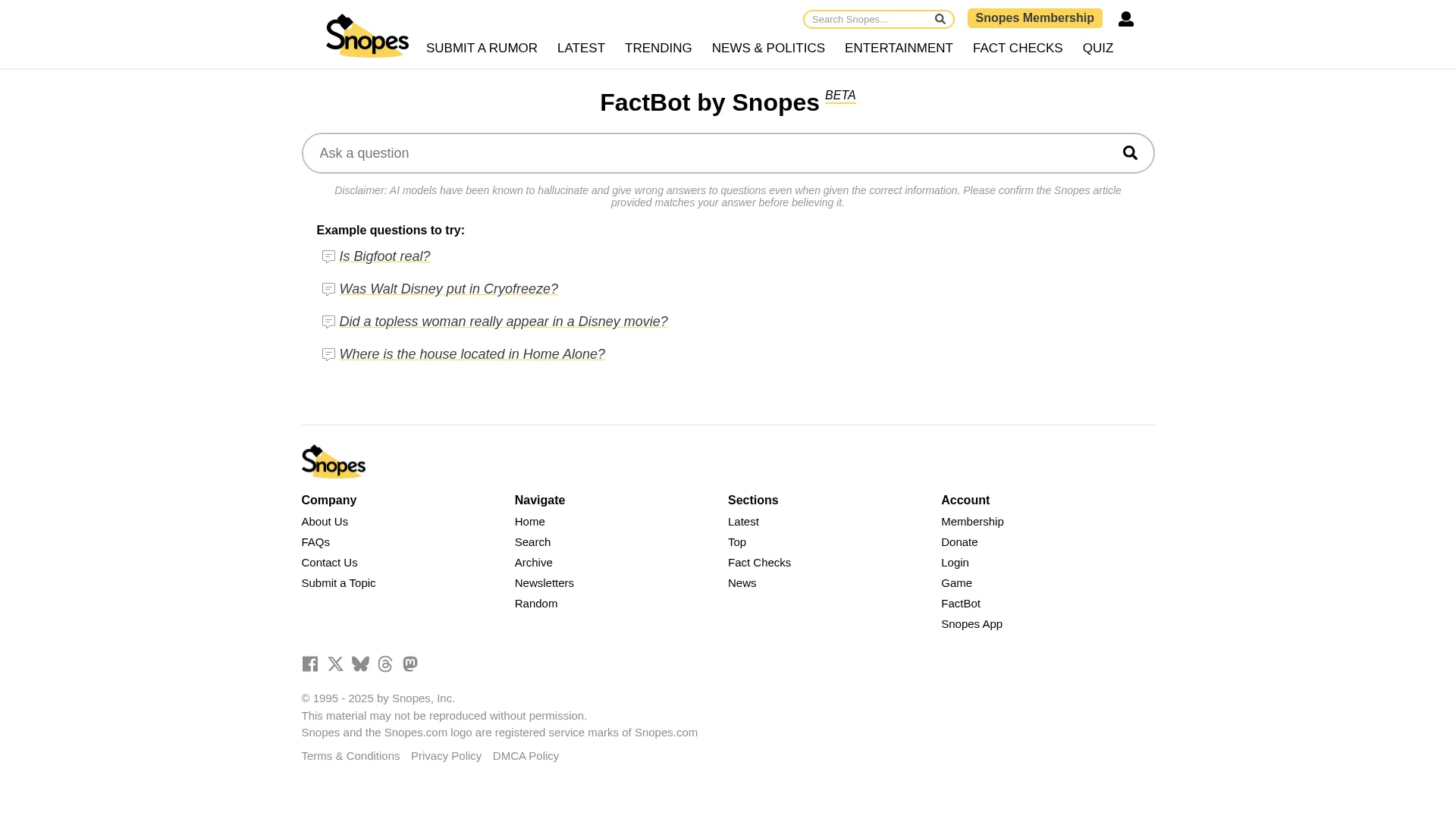 About Snopes Factbot : Snopes Factbot uses AI-powered fact-checking to verify information and provide accurate results.