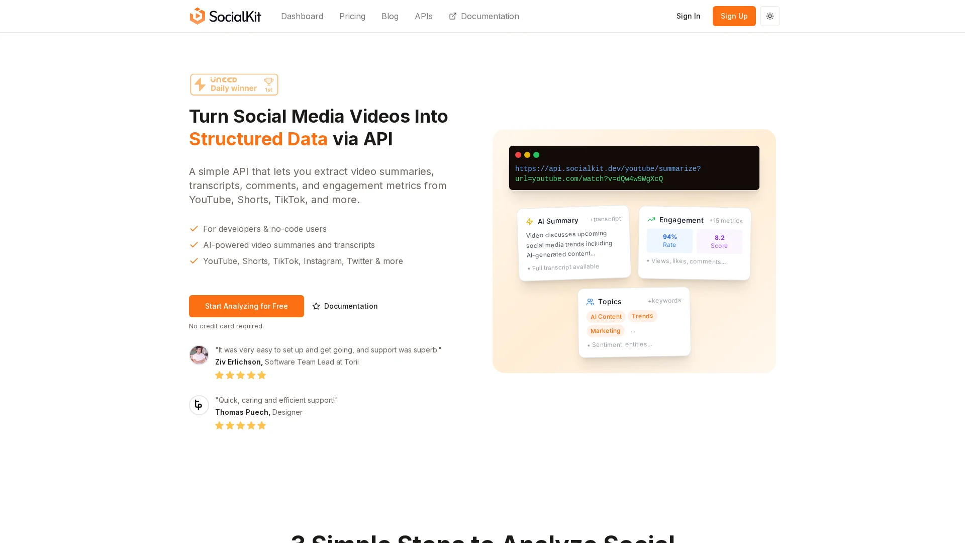 About Socialkit : SocialKit API turns social media videos into structured data. Get video summaries, transcripts, engagement metrics, and custom data from YouTube, Shorts, TikTok, Instagram, and more.