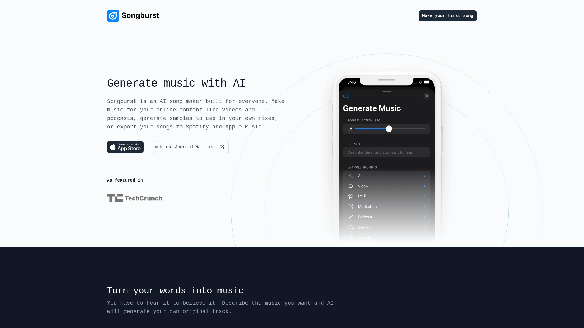About Songburst : About Songburst AI Music Generatortext: Songburst is an innovative AI music generator that transforms your words into original songs, fully free to use in any content.