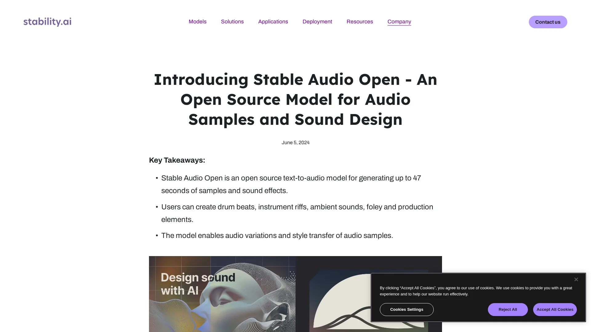 About Stable Audio Open : Stable Audio Open is a free, open-source AI model designed for text-to-sound generation. It's optimized for creating short audio samples, sound effects, and production elements.website: https://stability.ai/source: Open Sourcestatus: Active
