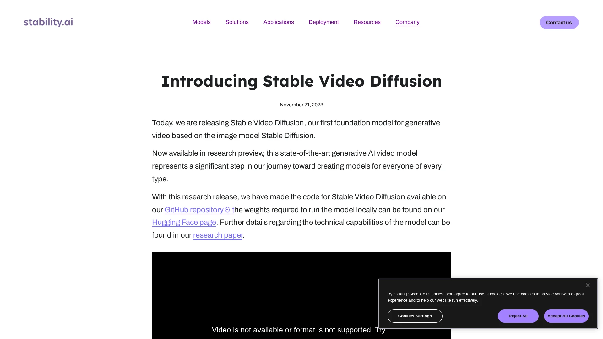 Stable Video Diffusion is a proud addition to our diverse range of nopen-source models. Spanning across modalities including image, language, naudio, 3D, and code, our portfolio is a testament to Stability AI’s ndedication to amplifying human intelligence.