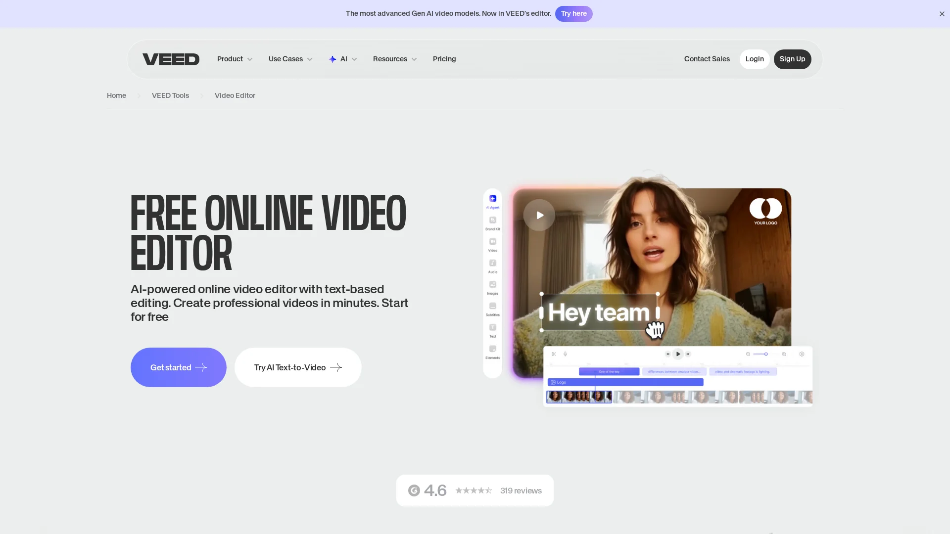 About Veed : Edit videos quickly with VEED.IO's free online video editor. Use text commands or editing text to create professional-looking videos. Polish your work with AI-powered auto edits and add B-roll and music.