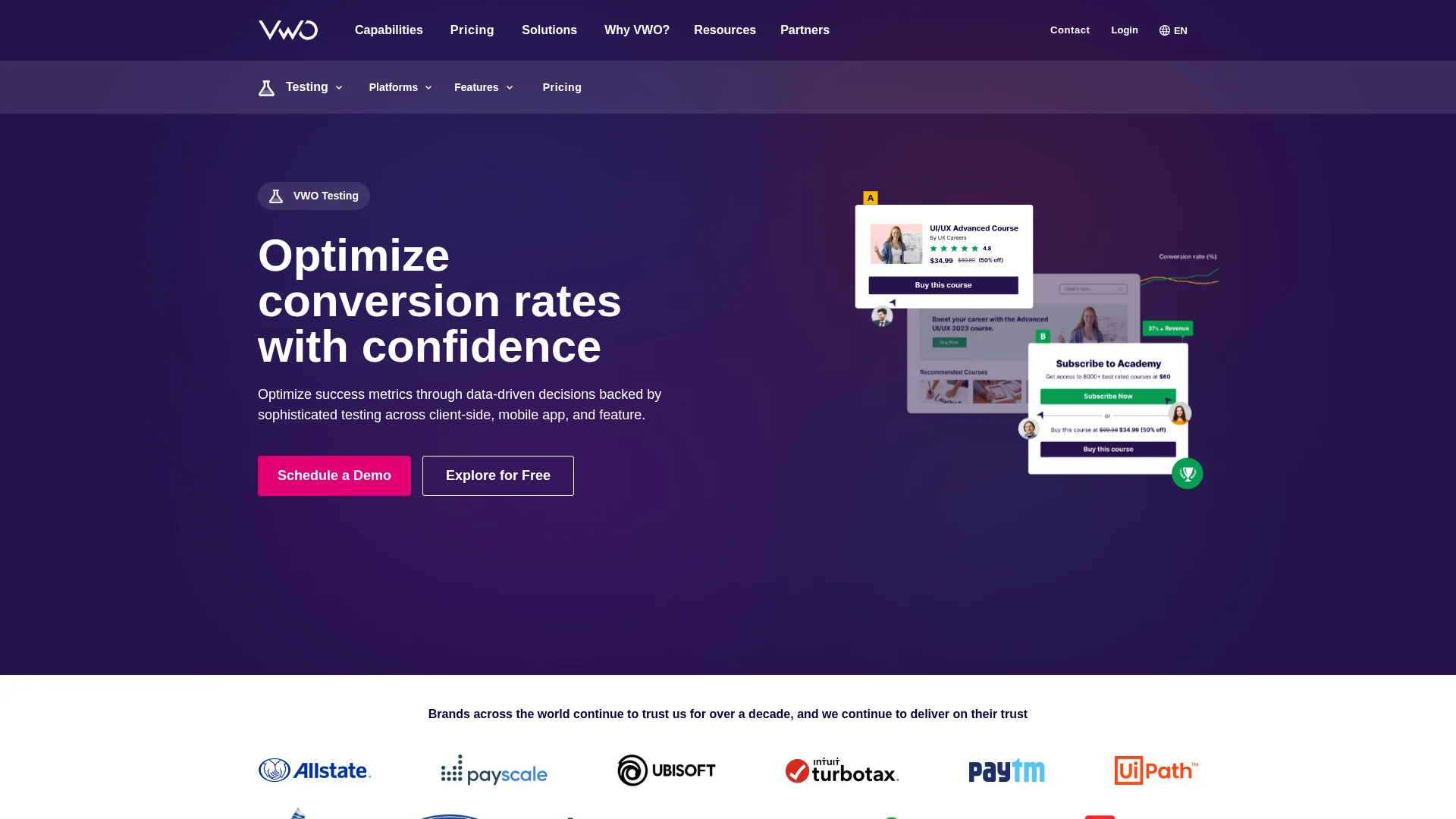 VWO Testing, part of VWO Platform, helps you and run A/B, split, multivariate, and feature tests to optimize user experience & increase conversion rates across web, mobile, servers, and other devices.